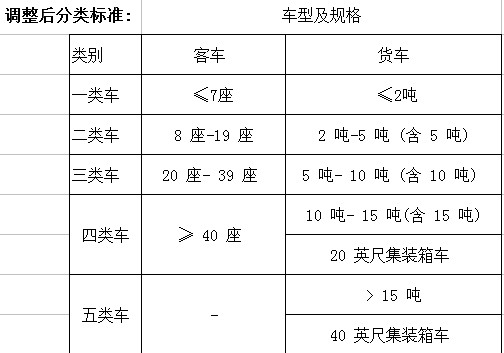 如車頭高度小于1.3米,座位數(shù)大于或等于8的小轎車由原一類車上升為二類,收費(fèi)上升;車頭高度大于或等于1.3米的,但座位數(shù)小于7座的面包車和小型客車由原二類車下調(diào)為一類;2軸6輪,10座及以上、19座以下的中型客車,19座大型客車由原三類車下調(diào)為二類,收費(fèi)下降。