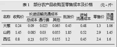 (1)通行費(fèi)占農(nóng)產(chǎn)品流通環(huán)節(jié)成本的比例較小。以重點(diǎn)調(diào)研的幾種蔬菜為例,大蔥、山藥和西瓜各環(huán)節(jié)的價(jià)格詳見表1所列。表1中長途運(yùn)輸流通成本中的“其他”包括裝卸、包裝、存儲(chǔ)、物品損耗、運(yùn)輸燃油費(fèi)、工人工資罰款和車輛維修等費(fèi)用,“進(jìn)城流通成本”包括批發(fā)市場(chǎng)攤位費(fèi)、進(jìn)城運(yùn)輸費(fèi)、停車費(fèi)、罰款、超市攤位費(fèi)和包裝、存儲(chǔ)、物品損耗等。從表1可以看出,大蔥、山藥、西瓜占長途運(yùn)輸流通成本的比例分別為:28%、35%、33%,占總流通成本的比例分別為:4%、5%、11%,占產(chǎn)品最終銷售價(jià)格的比例分別為:1.2%、0.3%、3.1%。而3種農(nóng)產(chǎn)品在流通過程中每斤分別升值了1.06、1.45、1.6元,主要是從批發(fā)到零售這一環(huán)節(jié)增長的。由此可以看出,干線運(yùn)輸中的通行費(fèi)在農(nóng)產(chǎn)品流通過程所起的升值作用很小,即使通行費(fèi)全免,也不會(huì)對(duì)收購價(jià)和零售價(jià)造成較大的影響。