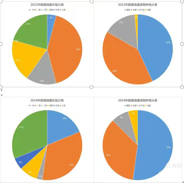 3.自集團(tuán)“綠色通道”車(chē)輛專項(xiàng)治理工作要求以來(lái),鄭庵收費(fèi)站精細(xì)化梳理排查假冒綠通類別,針對(duì)性強(qiáng)化查驗(yàn)。假冒綠通車(chē)型和貨物種類分類如圖: